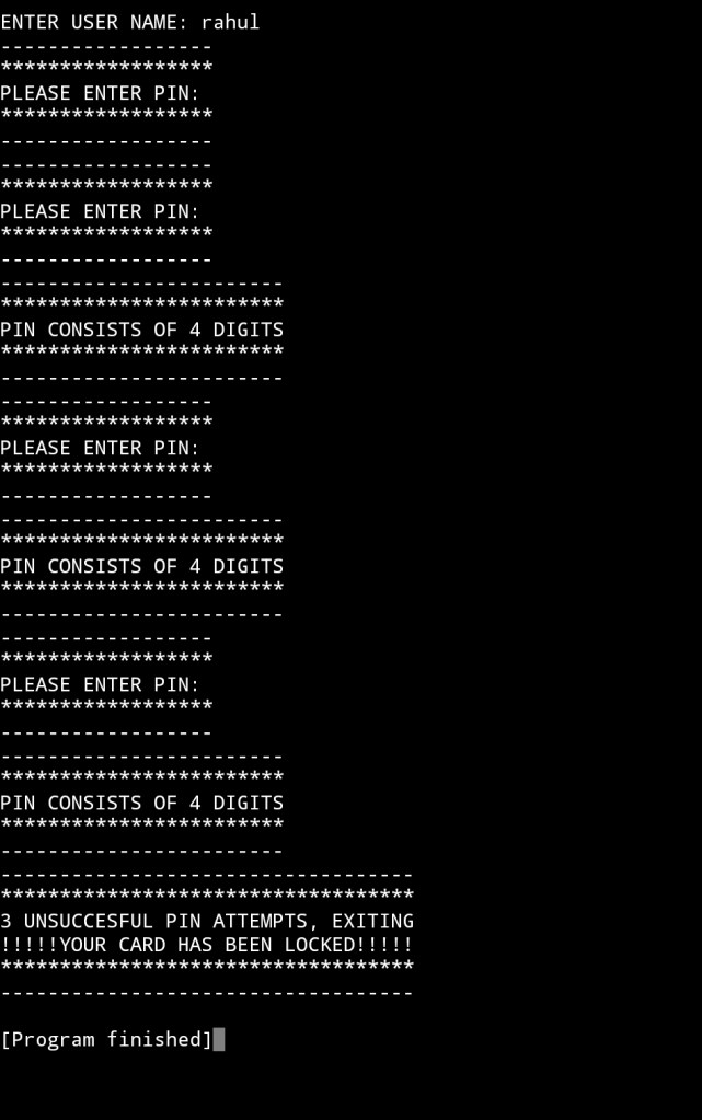 print(‘3 UNSUCCESFUL PIN ATTEMPTS, EXITING’)